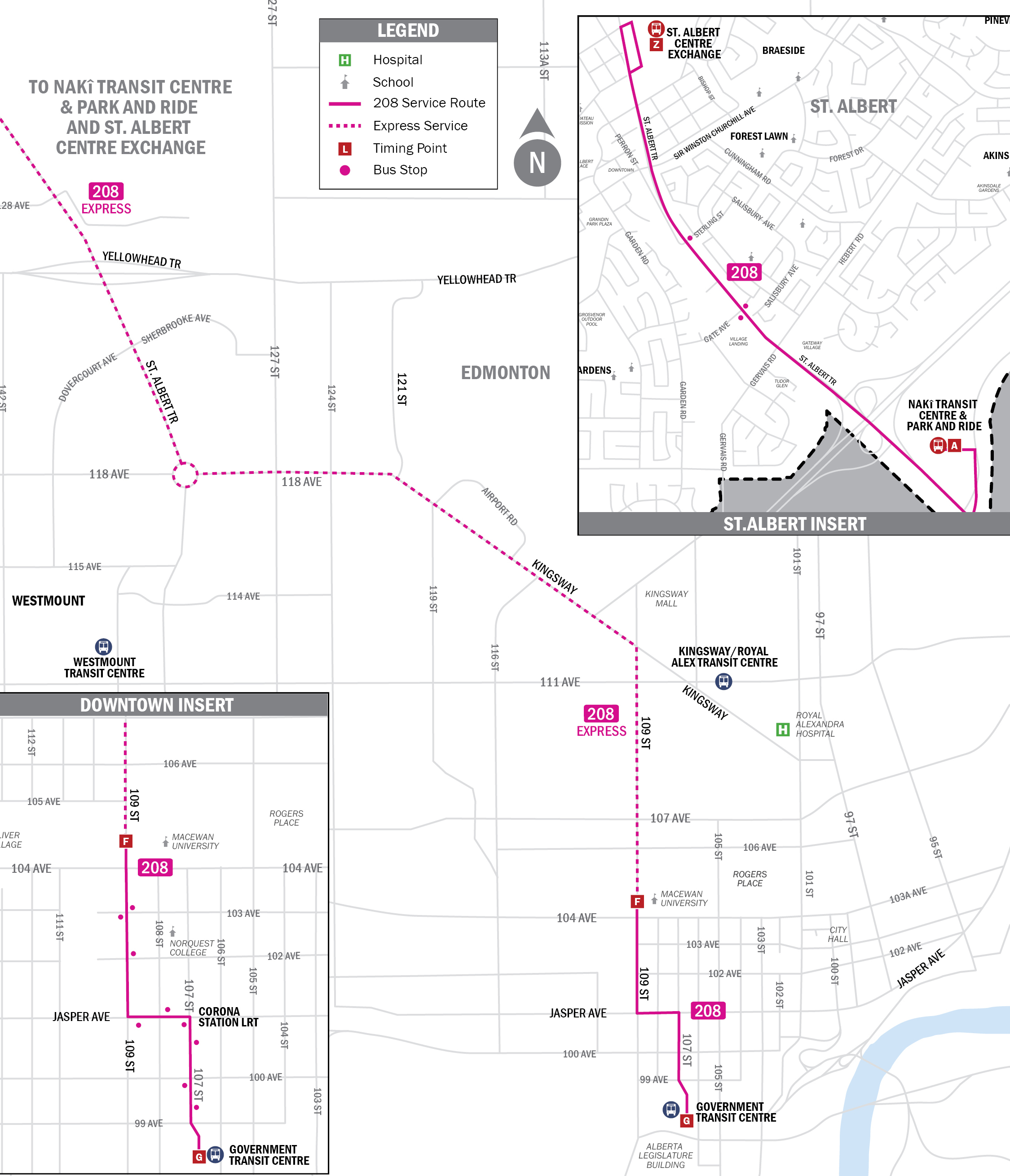 | St. Albert Centre Exchange Departure | Nakî Transit Centre Departure | MacEwan 109 St / 105 Ave Southbound | Government Transit Centre Arrival |
