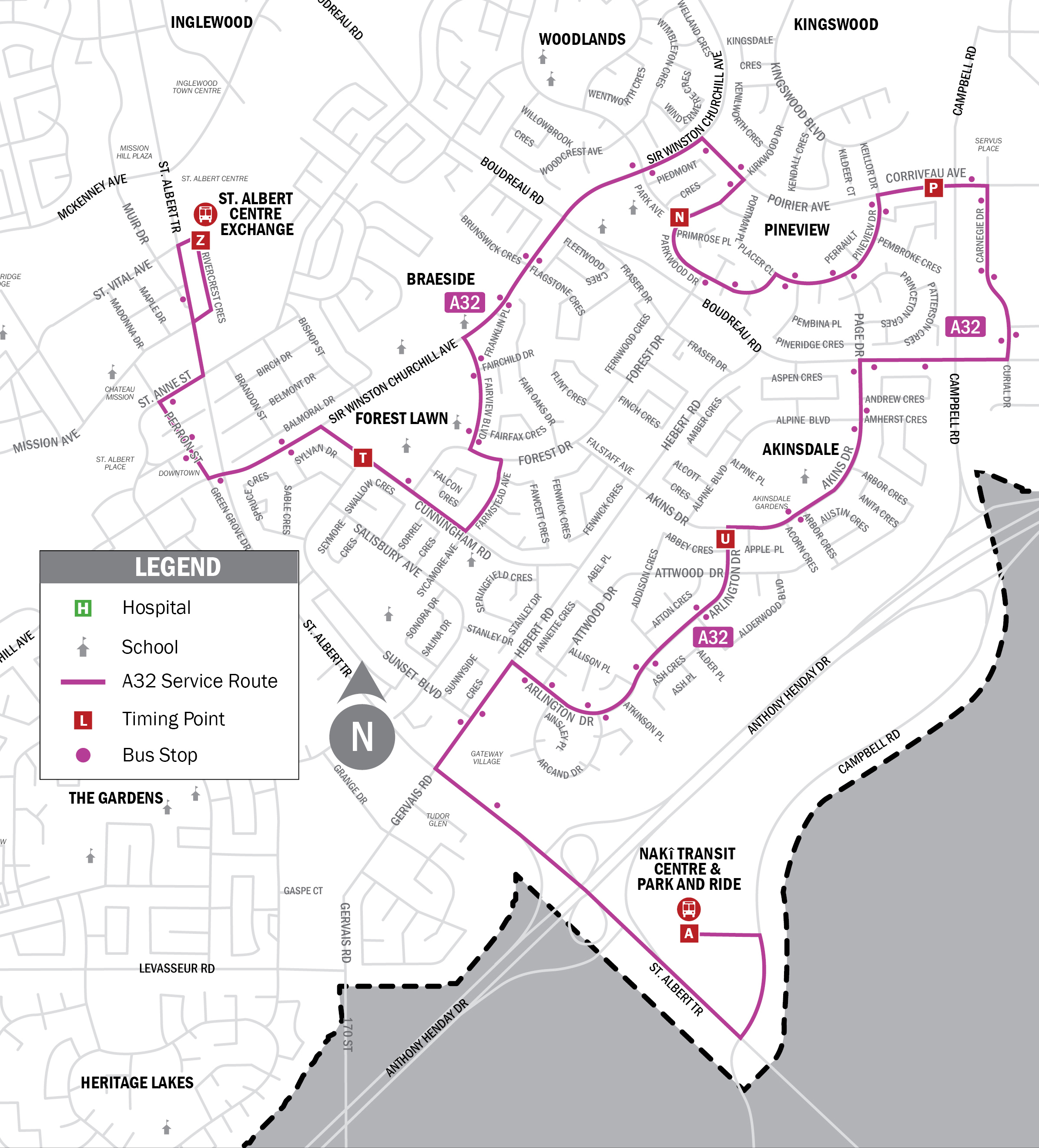 St. Albert Centre Exchange Departure | Cunningham Rd / Sunset Blvd Eastbound | Parkwood Dr / Park Ave Southbound | Poirier Ave / Campbell Rd Eastbound | Arlington Dr / Akins Dr Southbound | Nakî Transit Centre Arrival |