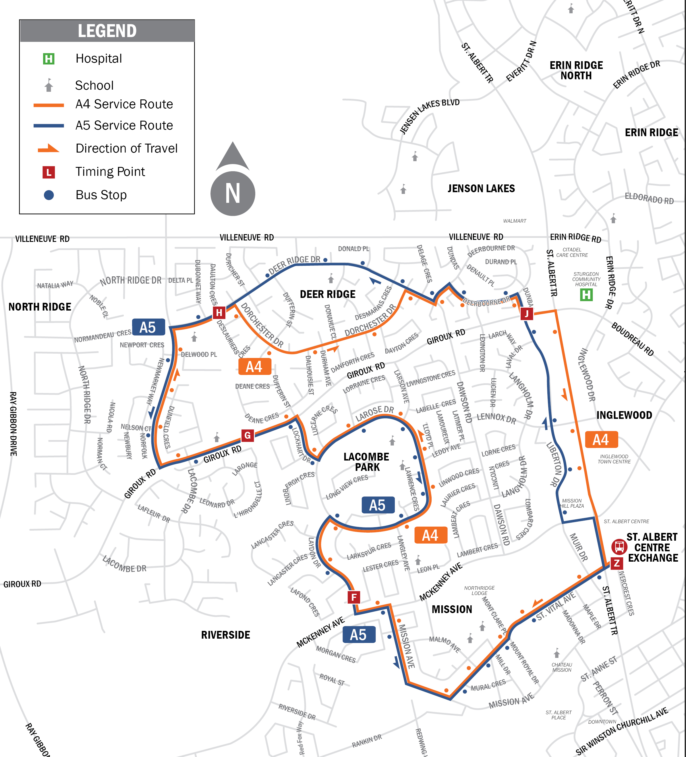 | St Albert Centre Exchange Departure | Laydon Dr / McKenney Ave Northbound | Giroux Rd / Bellerose High School Westbound | Dorchester Dr / Deer Ridge Dr Southbound | Giroux Dr / Liberton Dr Eastbound | St Albert Centre Exchange Arrival |