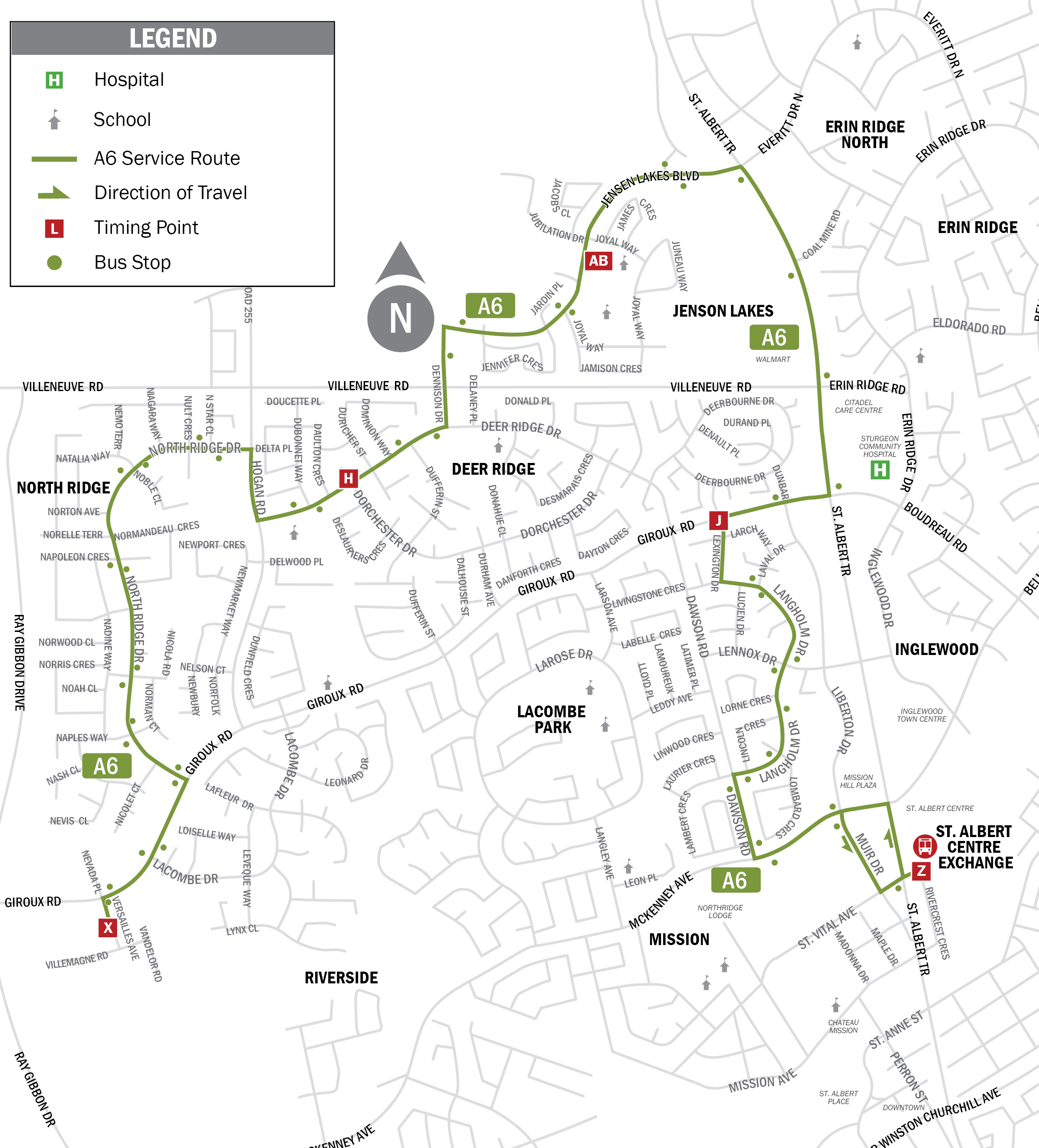 | Versailles Ave / Giroux Rd Departure | Dorchester Dr / Deer Ridge Dr Southbound | Jensen Lakes Blvd / Joseph Demko School Northbound | Giroux Dr / Dunbar Dr Westbound | St Albert Centre Exchange Arrival |